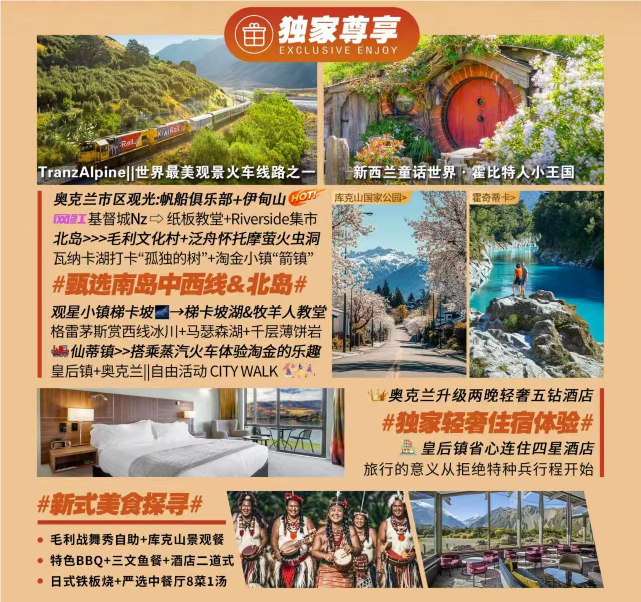 | 第07天 | 观星小镇地区v基督城Q奥克兰;升级5钻住宿 参考航班: NZ546(1300/1425)或其他下午航班,具体以开票为准 | ||