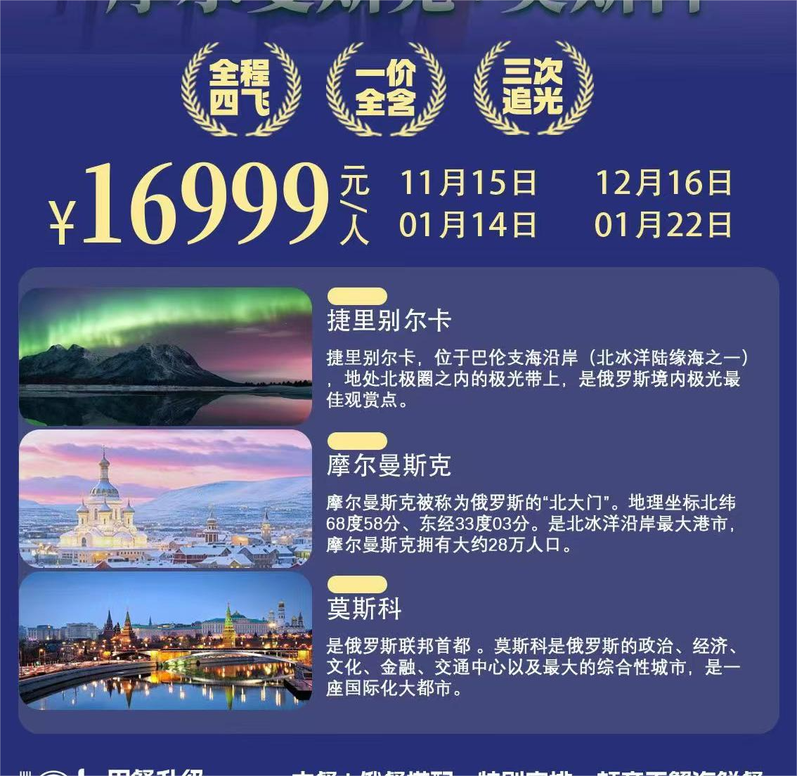 早餐后,从摩尔曼斯克出发,前往北部的【捷里别尔卡】(140公里,程车程约2.5小时),沿途不断变化的自然风光让你惊叹大自然的力量! 午餐安排当地俄餐,边享用美食,边观赏蔚蓝的北冰洋风光,看着远处的冰山。 晚上特别安排第二次【追逐极光】(追光约3-5小时)根据天气和气候而定,不保证一定能看到极光。 温馨提示:因摩尔曼斯克特殊的地理气候等,在每年的11-次年2月期间, 若遇特殊极端天气,捷里会封路,若因为不可抗力导致无法前往捷里,则会替换为基洛夫一日游。 |