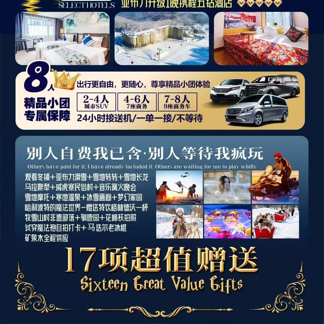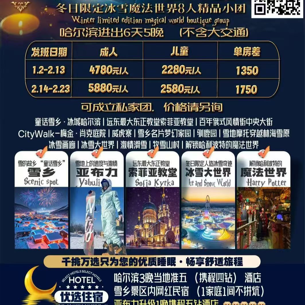 【拍摄网红“泼水成冰”】(自行体验)今天早上可以早点起哦~酒店房间里烧几壶嘎嘎的热水,装满自己的保温杯,伴随着清晨第一抹阳光快要从远山喷薄而出的时候,一定要找两个人一起配合;找好太阳要出现的瞬间做背景,拉慢镜头,一个照片,一个摄影,一起喊口号,一、二、三;嗨跳起来,一气呵成,泼水成冰,就这么成啦,哈哈今晚都i因霸屏就靠你啦! 【雪乡民俗文化馆】了解东北林业发展史,伐木生活,东北的资源宝藏。观赏独具东北。坐落着一座座【民俗风韵的建筑群落】,小木屋层层叠叠,高低起伏,屋舍相连,一派天成,被誉为雪乡雪景之源,是您体验东北民俗、观赏林海风光、摄录旷世佳作的绝佳去处。 【中国雪乡童话邮局】雪乡邮局也是很值得去的地方,在这里给亲朋好友寄上一张名信片,把带着温度的祝福送给你爱的人,意义非常同小可啊。 【雾凇长廊】前往哈尔滨路上公路的两旁结满了晶莹洁白的树挂,这些树挂仿佛经过了能工巧匠的精心雕刻,在阳光的照射下摧残夺目,千姿百态,不亚于吉林柳树结银花,松树绽银菊的十里长堤,把人们带入如画如诗的仙境。这个曾经的“北大荒”,现如今的“锦绣乡”,此时此刻美得不像话,像童话!浩瀚的临海,银色的乐园。置身十里画廊,在云海中看霞光冲破雾锁,在辽阔的原野中赏晶莹冰雪,在空旷的天地间呐喊或放歌一曲。。。那是一种忘我的陶醉,是一种天赐的感动,是一种童年的回归。不光有雪,还赠送大片的雾凇长廊。雾凇,俗称树挂,为我国四大奇观之一。 【雪地摩托】 在山谷密林间自由飞驰,体验雪原上的灵魂游戏,感受巨大的轰鸣声在林海雪原原始气息中传播,在速度与激情里尽情释放生活压力雪乡必备网红打卡。 【冰雪画廊】十里画廊的雪洁白无暇,在这里,你可以尽情地欣赏冰雪国度的胜景,感叹大自然的神奇,这里拥有令人惊叹的雪松,美妙的雪景,在这条银色的画廊中行走,犹如误入童话里的冰雪王国,让人必胜难以忘怀。 【牧雪山村非遗部落】中国雪乡的灵秀之地,厚重的积雪,随物塑性,雪房子,雪蘑菇,冰雪动物精灵,原始的村庄部落,保留着原始的民宿风情。 【哇酷冰雪乐园】雪山之巅天然冰雪游乐园,专业的赛道,右越野车牵引着【雪地长龙】,穿越林海。高低起伏,尖叫声一浪高过一浪,雪地长龙老人和小朋友也能玩哦,乘坐【雪地转转】飞舞盘旋,掀起阵阵雪花,让您感受童真浪漫的童话世界。 前往哈尔滨入住酒店 【温馨提示】 如遇大雪哈牡高速封路,则可能行程调整为哈尔滨到亚布力改为硬座或动车,费用自理 | |||||||||