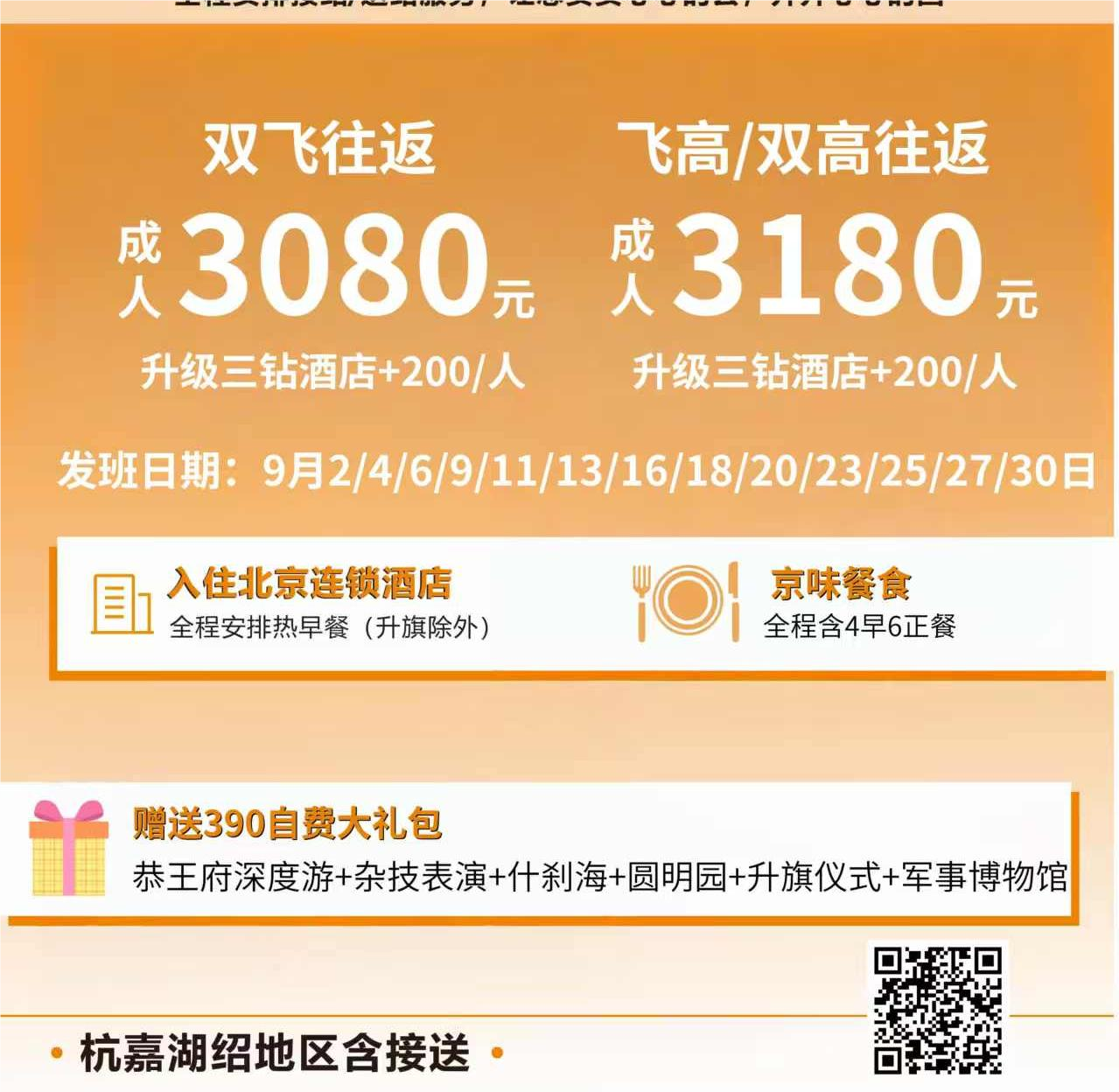 游览景点:颐和园(游览约3小时) 我国现存规模最大、保护最完整的博物馆式皇家园林。晚清时期作为慈禧太后的颐养之地。颐和园是利用昆明湖、万寿山为基址,以杭州西湖风景为蓝本,汲取江南园林的某些设计手法和意境而建成的一座大型天然山水园。车览高等学府【清华大学或北京大学】外景。 游览景点:天坛公园 游览明清两朝历代皇帝祭天之地【天坛公园】是世界文化遗产,明清两代二十四位帝王举行登基大典及祭祀天神的专用祭坛,也是世界上现存规模最大,最完美的古代祭天建筑群。(首道门票,不少于1小时)。 游览景点:前门大街 安排有600年历史的“天街”【前门大街】(不少于1.5小时)看看北京的老字号、逛逛北京的大栅栏,尝尝鲜鱼口的北京小吃 游览景点:军博(或其他博物馆,具体以约票为准) 乘车前往【军事博物馆】 中国人民革命军事博物馆是中国唯一的大型综合性军事历史博物馆,军博收藏34万多件文物和藏品。其中国家一级文物1793件,大型武器装备250余件,艺术品1600余件,对外军事交往中受赠礼品2551件。其中有铜鎏金弩机、镇远舰铁锚、叶挺指挥刀、三八式步枪和解放军第一辆坦克等重大历史价值文物 晚餐后入住酒店休息。