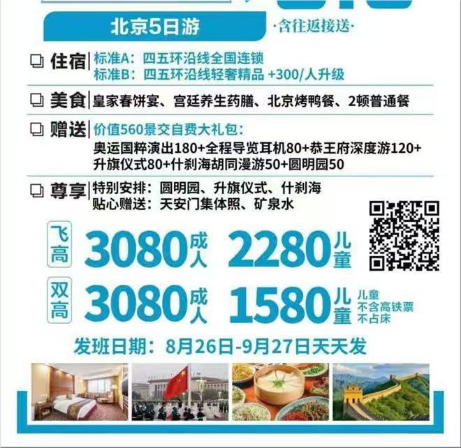 早餐打包,前往天安门广场观看大国礼仪神圣典礼【升国旗仪式】(如预约不上升旗则改为降旗,旅行社不承担任何责任),游览【毛主席纪念堂】瞻仰毛主席仪容(若遇政府关闭或限制团队流量预约不上则改为参观外景,旅行社不负任何责任),游世界现存最大的古代宫殿建筑群【故宫博物院深度游】(首道门票,不少于2小时),身处红墙黄瓦,金碧辉煌的殿宇楼台中,穿越时光年轮追溯那鼎盛的康乾盛世,眼前浮现历史的滚滚烟幕。 中餐安排特色【北京京味菜】特别安排品尝北京烤鸭体验老北京的美食;后参观【什刹海胡同漫游】(不少于45分钟。)什刹海指前海、后海、西海三个湖泊及邻近地区,这里拥有大片优美的湖面,也是北京著名的一片历史街区,众多名人故居,王府等古迹散落其中,还有贴近老百姓生活的各种美食,后海酒吧街更是京城夜生活的老牌胜地。 游览明清两朝历代皇帝祭天之地【天坛公园】是世界文化遗产,明清两代二十四位帝王举行登基大典及祭祀天神的专用祭坛,也是世界上现存规模最大,最完美的古代祭天建筑群。(首道门票,不少于1小时),后观北京【国粹表演】——京城第一秀(与海内外上千名游客共同欣赏为北京奥运特创编排,节目精彩绝伦,观看1小时);晚餐后入住酒店休息; ☆温馨提示:1、当天行程景点位于北京古老中轴线上,全天以步行为主。加之此中心区域为国家重要职能部门所在地,交通管制严格明确,单行道内不可随意停车。故在此区域候车时间较长,步行路程较多,敬请提前做好心理准备,谢谢配合及理解。